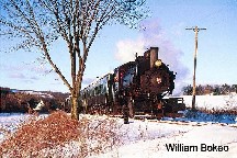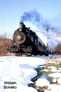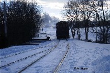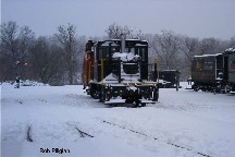 The 2003 Santa Trains afforded a rare opportunity to see WK&S steam trains running in snow. The morning of Saturday December 6th finds a snow covered L&NE caboose behind a motor car. Photo by Rob Piligian