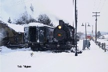 Locomotive #65 comes to life, taking water at Kempton station. Note the steam line in the snow running from the front of the locomoitive to the end of the coach. The train is steam heated day and night during the weekend. Photo by Rob Piligian