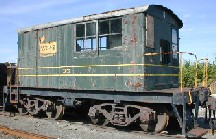 Mack Gas-Electric locomotive #35. This locomotive is permanently out of service and is seen here resting on a pair of freight car trucks. |