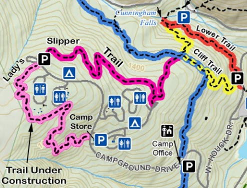 Cunningham Falls State Park at Thurmont. 2022/August - Our first visit. We stayed in the upper William Houck Area in the Addison Run Loop at site 1. Site 1 is probably the best with a deep woods view and a partial view of incoming traffic. Awning faces north with lots of trees and good shade all day. Sites 5 and 7 may be an okay second and third picks. Electric only. Addison Run Loop is probably the best for both power and pets. Hydrant at site 4. Clockwise traffic so all hydrants are curbside. Probably need 50' of hose to reach both fills. Strong cell signal all around. Odd security with coded entry gate and tire spikes if you go the wrong way. Dump station lane is at the campground office beyond the tire spikes. Apparently the day use areas down at the lake get packed out. Guess the campground area needs to be "defended". The campground map is pretty abstract. The loops are separated by distance and elevation. No level strolling. Trail map. We hiked the Campground Trail to the Cliff Trail to Cunningham Falls which was only about a mile, but brutal with steep rocky terrain. So there's a general lack of hiking and strolling options without driving elsewhere. There aren't really any moderate hiking loops (our stay slightly predated the new Lady's Slipper Trail). Drove down to the lake (doesn't open till 8:00) and did the Lower Trail back up to the Falls (bad picture). Pleasant easy hike. Manor Area notes: Seemed a bit hotter and steamier down there. Some highway noise. More of an honor box mentality without all the nutty security up at the Houck Area. Only a few electric sites. 15 had a isolated view and was in hose range of a hydrant. 9 and 6 may be okay second choices. No dump station. Avery and Visitors Center. The Furnace Trail is neat. But again, limited hiking and strolling options. Maybe okay for a couple of nights, but not a week. The campground at nearby Gambrill State Park may be worth a look.