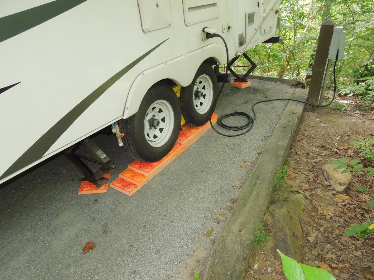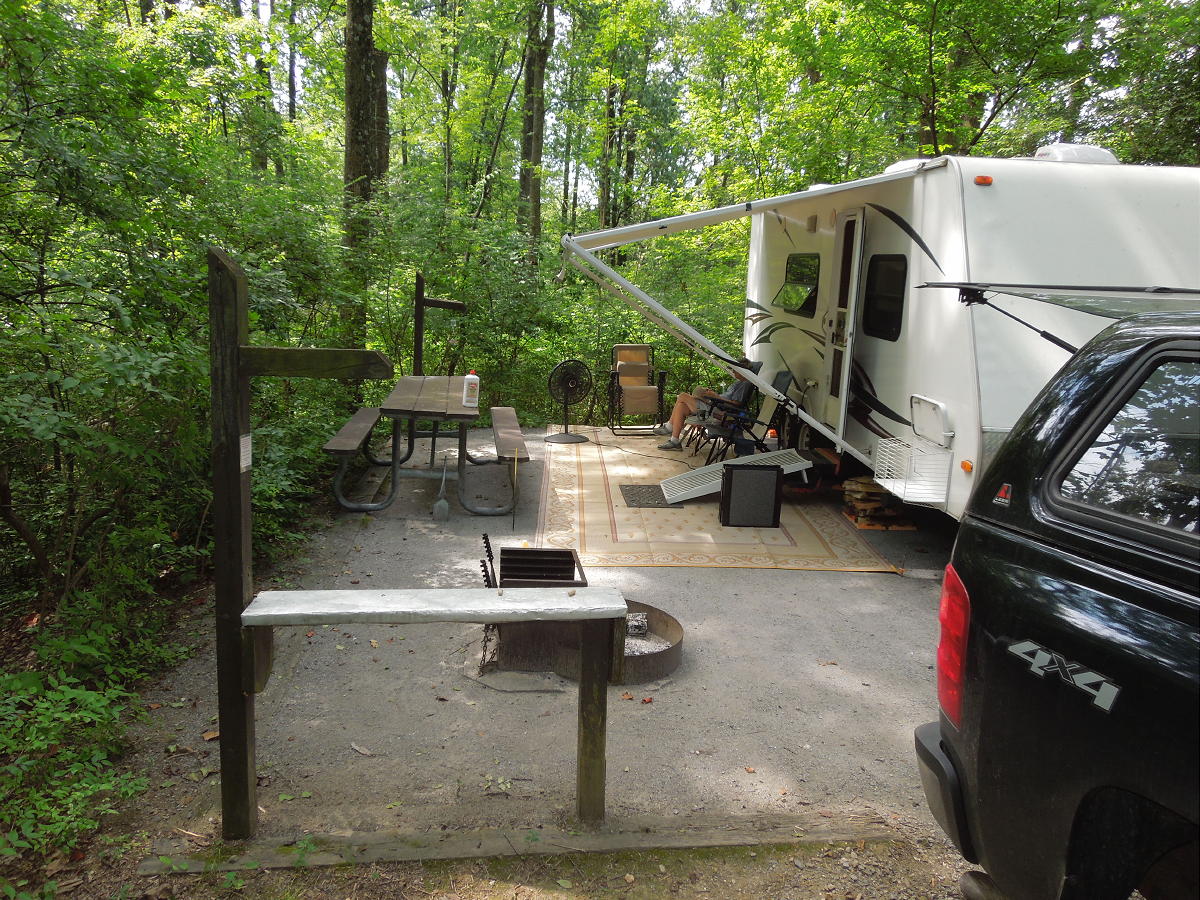 Gambrill State Park at Fredrick. 2025/August - Another stay in site 22. This time we stayed back from the streetside edge, which made spotting and leveling easier. The awning side was still manageable. The week was a miserable, hot, muggy gnat-fest (even under the awning with the fan blasting away). We stuck with early morning walks around some of the shorter trail loops. More good takeout from Dutch's Daughter. Spinners was still not open. Hummingbird on the last day. 2024/August - Another good stay in site 22. This time I got closer to the edge, which made leveling worse. Five layers of levelers under the rear wheel and four under the front. I still say site 22 is the only site worth having, but setting up is a chore. Gates are locked over night, but they provide the padlock combination to get out hiking before 8:00 am. Again, we did most of the southern loop trails. And we did the northern Headless Hollow trail, which was worth the drive. Another good outing to Dutch's Daughter. Spinner's was between locations, so no pinball this time. Maybe we'll try Greenbrier State Park next time. 2023/August - Our first visit. We stayed in site 22 which was probably the best. All sites were small. Site 22 was moderately sloped back (consider pulling the spring bars up top), but way off from side to side. Plan on four layers of levelers under each streetside wheel. The site faced east toward cabins 4-6. But there was enough underbrush in between that it wasn't overly annoying. Lots of big trees and good shade all day. The hydrant for the 12-23 loop was by site 13 (not shown on many maps). The other five electric sites 1, 12, 13, 20 and 23 were more exposed and faced the road or other sites. Full-hookup sites 28-29 were for the camp hosts. Why two? Only 28 was occupied by a host. Check in paperwork was on the bathhouse bulletin board. Honor box firewood ($6 or 3 for $15) was in the little doghouse by the bathhouse. Great hiking. The campground had direct access to the red trail. But the thing to do was drive to the parking lot between Rock Run and High Knob. That lot provided direct access to most trails. We did the red, green and white loops plus the lower lobe of yellow and a few segments of black. The campground is only a short drive to Dutch's Daughter and Spinners. Overall we liked Gambrill better than last year's stay at Cunningham Falls.