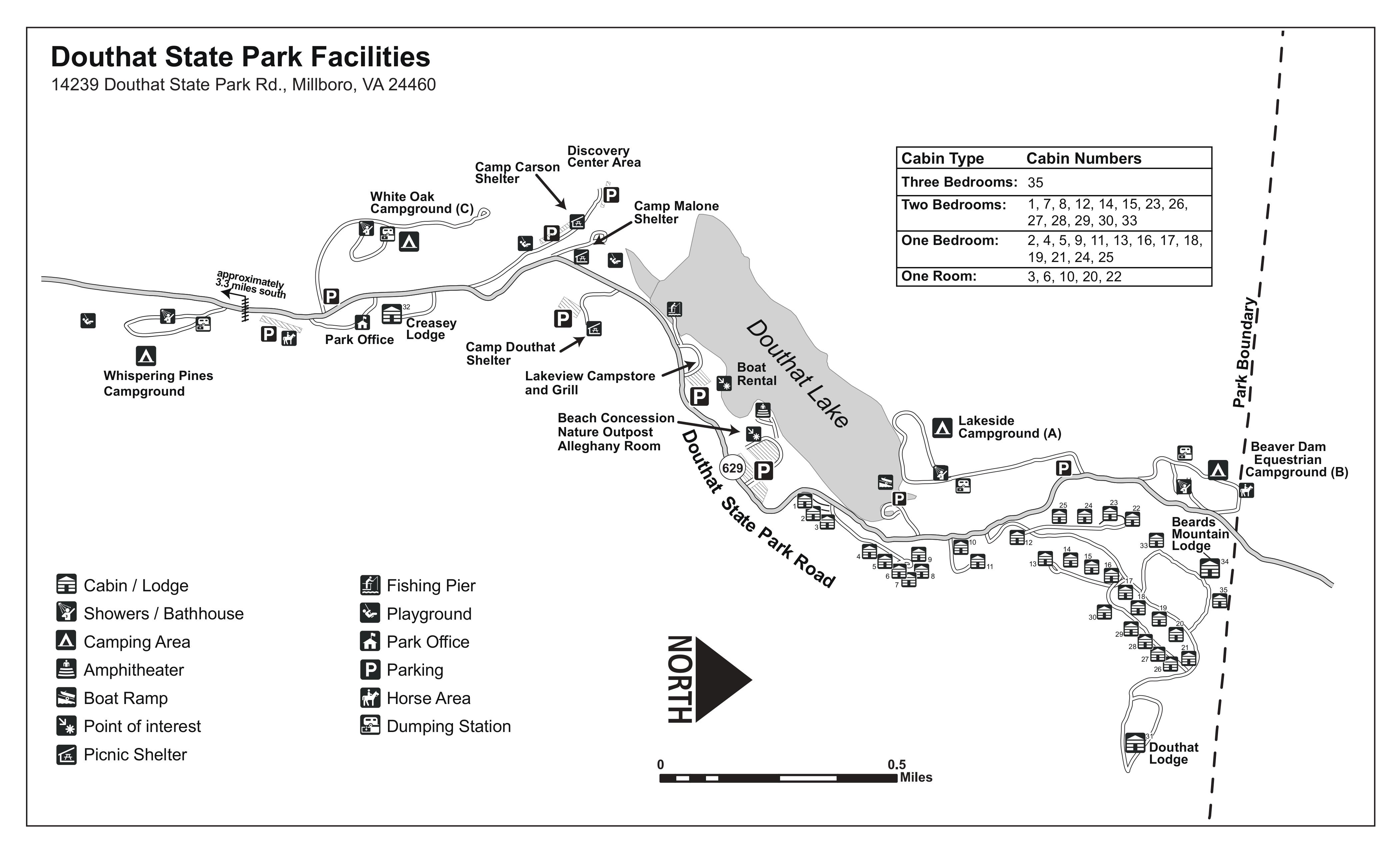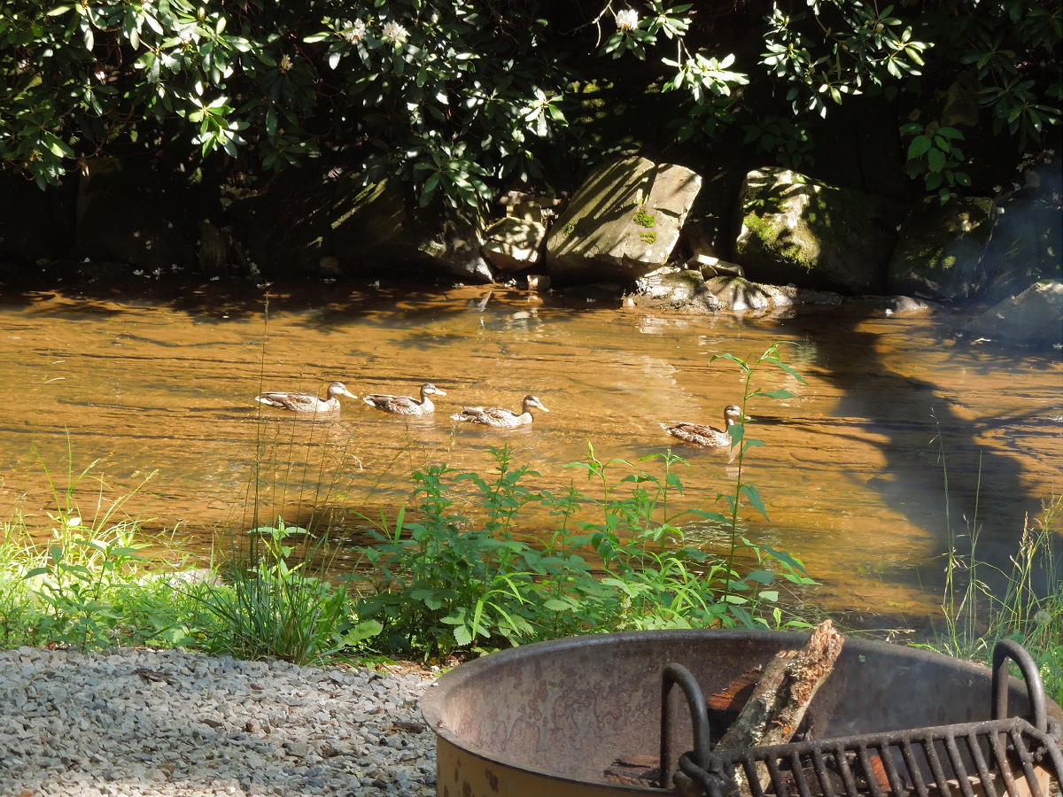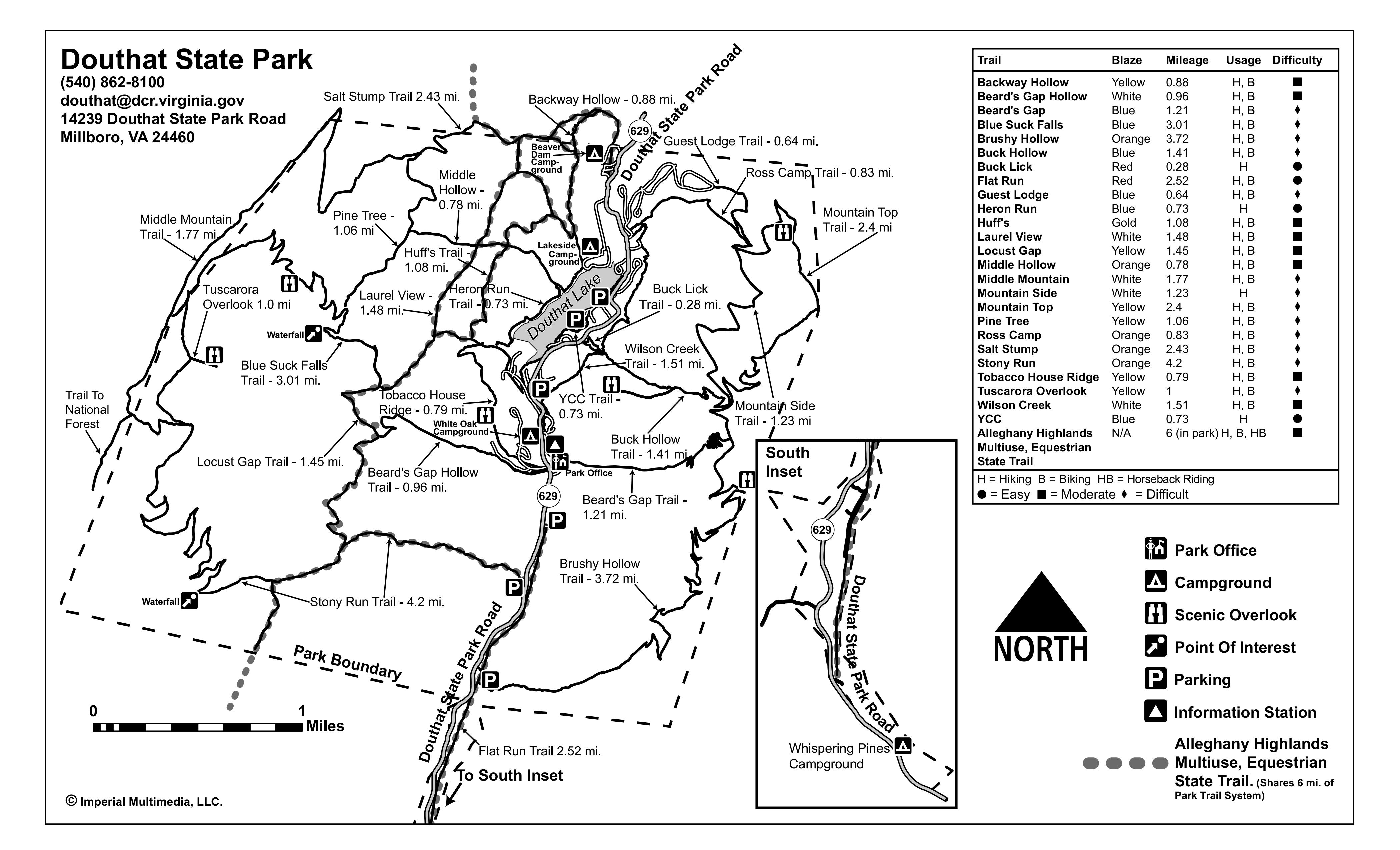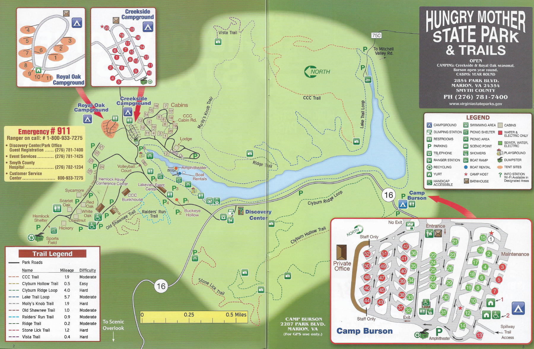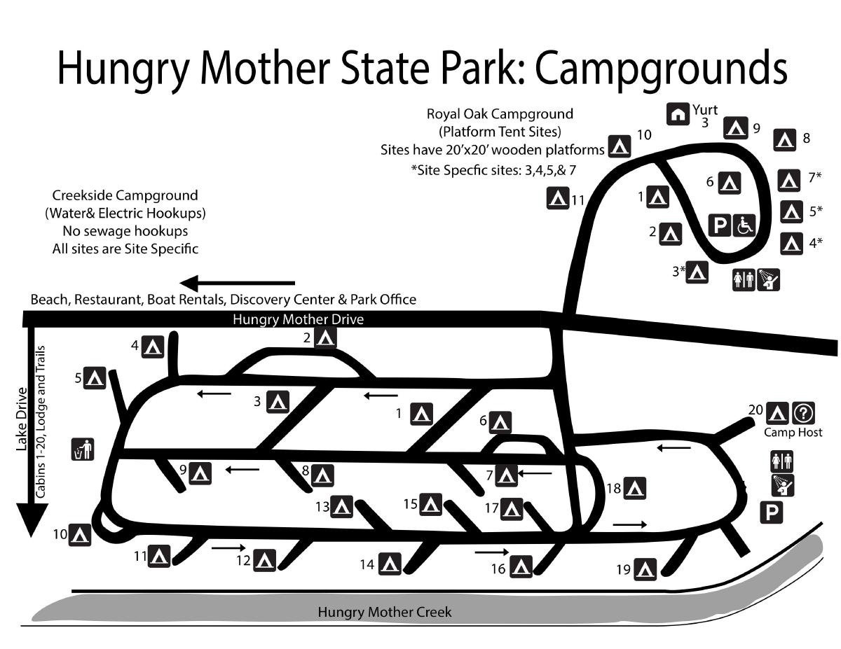 Hungry Mother State Park near Marion. 2025/June - Our first visit. We had Creekside site 14 with great creekside views. The awning faced southeast with good tree shade all day. The site had one of those old power boxes, but it was sufficiently bent to accommodate our right-angle plug. Sites 12 and 14 are about the only creekside sites to have. The others are too small or awkwardly angled. Site 14 was great once we were there, but I don't know that we'll go back. The Creekside campground is old. All the sites are small and densely spaced. The creek can be a kid-magnet. And the access road is crazy narrow with multiple blind, hairpin turns. Not sure what happens when two opposing RVs meet. Although I'm not a fan of conventional campground layouts, Camp Burson is probably the place to stay. End-sites 14, 43 and 44 looked okay, with 44 preferred as it's off in the corner with shade trees. Although on the fringe of the park, Camp Burson still had decent access to some of the hiking trails. Another issue was the 300 mile trip, which is a bit much for one day. Fortunately, our return trip was broken up with a stay at Douthat. We hiked out and back on the west leg of the Lake Trail through the day use facilities. We did the east leg of the Lake Trail and looped back on the Ridge Trail and bottom of Molly's Knob Trail. We did the east leg of the Clyburn Ridge Trail and looped back on the Clyburn Hollow Trail. The whole Clyburn Hollow Trail loop is probably doable. And we went out and back on the Lake Trail between the spillway and boat ramp. The nature walk by the boat ramp might be worth checking out on a cool or cloudy day. The Raiders' Run Trail and Old Shawnee Trail were closed due to storm damage. The Smyth County Museum in Marion was okay; probably don't need to do it again. We didn't notice much else of interest in town. There was sporadic cell signal here and there within the park, but no signal at the Creekside campground. Martin's grocery at I64 and Rt. 340 was a good RV-accessible gas stop. The Shell station at the Claytor Lake exit was a good RV-accessible gas stop. The Food Lion off Rt. 220 (on the way to Douthat) was a good RV-accessible grocery stop. Trail map. Facilities map. Creekside Campground map. Color map. 2024/June - trip canceled due to Life.