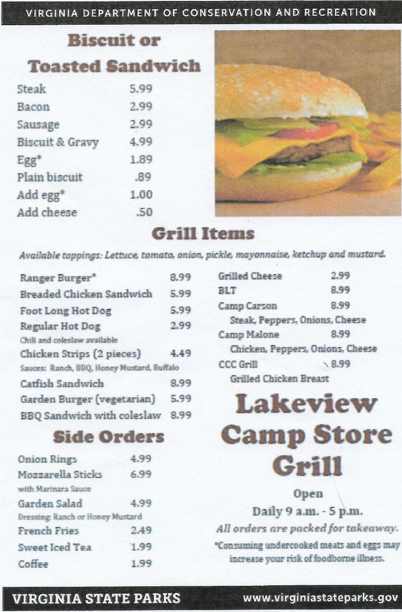 Occoneechee State Park near Clarksville. 2022/September - Back at site C29 eight years later. C29 is still the best for a wide open lake view. Otherwise the novelty has worn off. Hard, steep turn down off the cul-de-sac makes maneuvering into the site difficult. It was a hot, sunny week. Awning faces south into some good shade trees, but the late afternoon sun was harsh and the picnic/firering terrace was completely exposed. Under the awning became untenable by about 3:00 pm. The RV terrace is small. No room for the awning mat and trees block the awning from full extension. There was often a nice breeze blowing off the lake. Someone "vandalized" the small old power box such that our right-angled cord fit. Otherwise we would have needed the red cord. Great wooded hiking trail terrain. But no moderate-length loops and no direct access to anything from the campground. Map. If there's a next time I'd go for sites 30-33. They have more of a woods/cove view, but are far more protected. Plus the picnic terraces are all curbside. I'd pick 32 33 30 or 31 in that order. 31 and 32 are short and have corresponding truck parking spots across the road next to the little picnic pavilion. Last visited September 2014. We picked site C29 which was one of the most unique sites we've seen. It was perched on a man-made terrace overlooking Kerr Reservoir (i.e. Buggs Island Lake). The main terrace was just big enough for the trailer and there was a second terrace for the table and fire ring. Fantastic view! As neat as this site was, it was wide open to direct afternoon sun magnified by lake reflections. It was okay for the end September, but would be brutal during the summer. Lots of hiking, but there was so much else to do we didn't get to it. Clarksville was great with a neat little downtown area including some shops and the very dog-friendly Lake House Restaurant. They had an off-leash back patio area where all the locals gather with their pooches. The food was good too! The state park had on-site, dog-friendly pontoon boat rentals managed by Clarksille Water Sports. The lake is too big to ever get bored on a boat. We explored portions of Butcher's Creek, Grass Creek and Bluestone Creek. We puttered by our own RV and stopped at the municipal dock on the edge of Clarksville. We spent one day on a road trip to nearby South Hill which seems like a reasonably nice town. We visited their Model Railroad Museum in the old South Hill railroad station as well as their Tobacco Farm Life Museum which was one block west on Main Street. Both were worth the stop. We visited the Max B. Crowder Memorial Park (i.e. Whittle's Mill) which was a few miles outside town off Rt. 47. This remote undeveloped park had a beach-like area below the dam that was a great place to let the dog tear around. There's also an interesting old hydro power plant that may or may not still be operational. Neat park that I doubt many people know about. Next we checked out a trail head access lot for a section of the Tobacco Heritage Trail off Main Street (Rt.621) in the neighboring town of La Crosse. Looked like a nicely paved rails-to-trails path. We'll do a bike trip here if we ever make it back to the area. Lots of mosquitoes everywhere.
