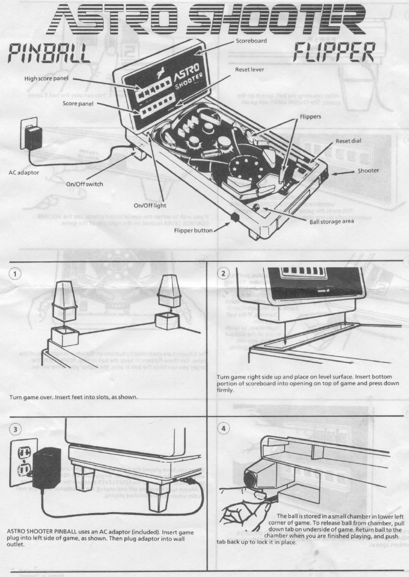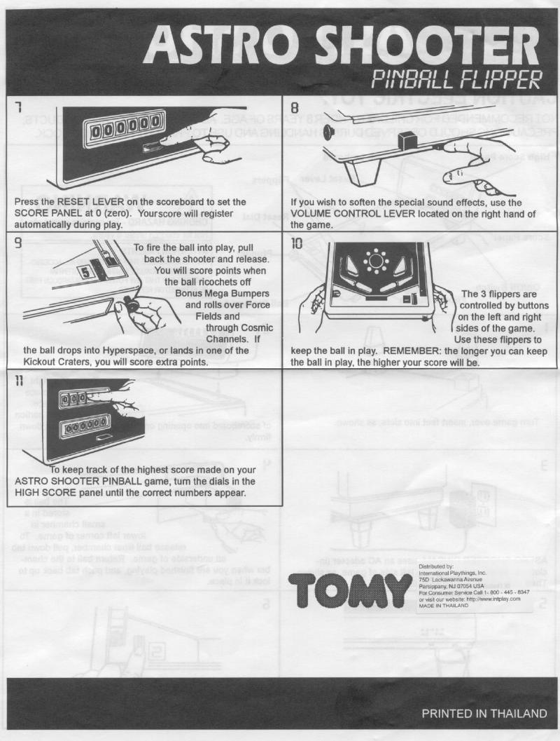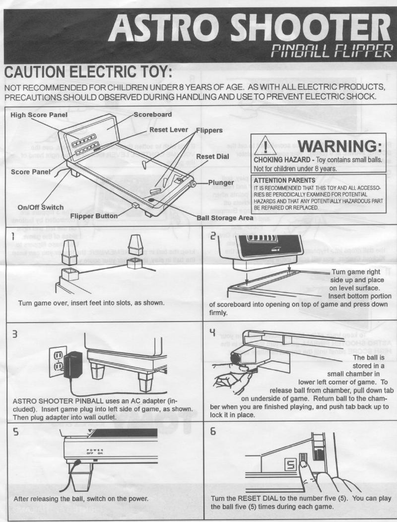 Tomy Astro Shooter pinball is Atomic Pinball's big brother. Astro Shooter is a bit larger and has quite a few more features. In fact, calling this game a "toy" doesn't do it justice. If you love pinball but don't have the space or money for a real machine, Astro Shooter may be a fun alternative. I believe Astro Shooter was available during the 1980s and '90s, but is no longer produced. Astro Shooter does not appear to have been as popular as Atomic Pinball, but was also twice as expensive. I got my Astro Shooter second hand off eBay. Unlike Atomic Pinball, Astro Shooter requires an AC power pack and has no provision for batteries.
