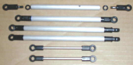 Now I linked up the rear axle to the frame. The pic above shows the links that connect the axle to the frame. From top to bottom, you see the two lower links, the two upper links and the two cantilever push rods. A couple of notes here... The rear push rods are longer than the front push rods. The shorter front push rods are identified by a indent at the middle of the rod. I'm guessing that the rear push rods are longer because the back of the truck ends up being heaver having to support the weight of the battery. The end links are connected to the upper and lower link rods byway of 20mm threaded rods (see top rod in pic). According to the manual, 10mm of the threaded rod should be threaded into the end link and 10mm should be threaded into the link rods. However, since the plastic end links are weaker than the metal link rods, it's better to thread more of the threaded rod into the end link. I was able the thread about 12mm of the threaded rod into the end link leaving about 8mm for the link rod. Notice also that a pair of plastic spacers is included with the lower link rods. Excuse the blurry pic.