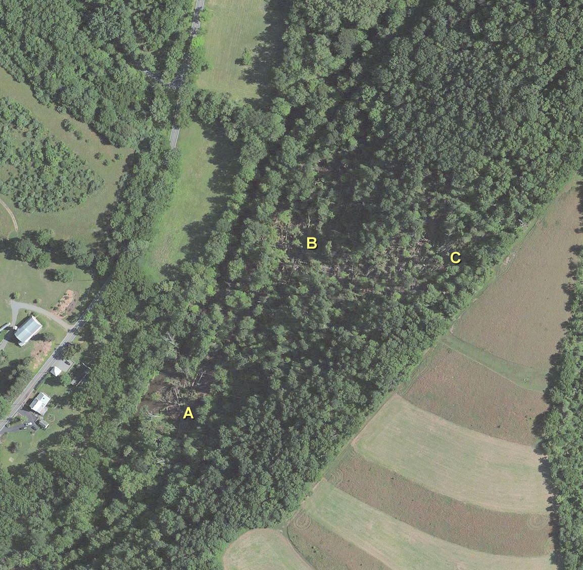 A 2012 satellite image is shown below (click on image for larger picture). The storm damage is considerably less impressive when viewed from space. But the pinpoint nature of the damage is interesting. The storm hit Furhmans Grove at A, moved north along the tracks to B then turned up over the hill to C.