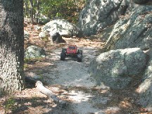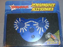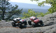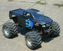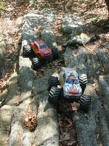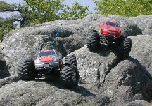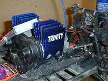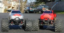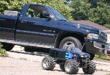 | My wife and I each have a Traxxas E-Maxx. Hers is the silver, mine is the red. The next four pics are from the mountains of West Virginia.         Here's my wife's E-Maxx fresh from the box.   Next up are two pics of my E-Maxx wearing a Parma Dodge Ram Body. The second pic shows the E-Maxx with big brother, my '01 Dodge Ram.     Traxxas likes to brag about their “fan cooled” Titan motors, but I never fully understood the concept. The internal fan is a variation on the old squirrel cage idea, blowing warm air out the sides of the motor can. But I didn’t really understand from where the cool air was supposed to enter the can to replace the warm air that is supposedly being blown out. The new Custom Motor Plate is not only thicker, but it has machined groves that expose the vents in the front of the motor can. With this arrangement I’m thinking that the internal fans may actually be worth something.   I tend to do a lot of high gear running in grass and I don’t like to take cool down breaks between packs. So I’ve made a few mods directed toward keeping the motors cool. In addition to the new motor plate, I’ve also added Trinity heat sinks and an external fan. This is the same little Radio Shack fan 273-240 that I’ve been using for my Super Brain project. The fan is secured to the RPM front shock tower with zip ties and is a perfect fit. It’s as if the two components were made for each other. The fan is powered from both packs (12 or 14 cells). That’s a lot of voltage for the little fan, but so far it’s held together.   I’ve also routed the motor leads over top of the motors. This is better than the stock arrangement. Even though the arrangement looks uglier, it keeps the wires from getting fouled up with the batteries. The motors are connected to the EVX with Deans plugs. The Tamiya connector seen in the pic is actually for the fan leads. What else… I drilled through the shock towers such that each pair of shocks is secured with only one long screw and a nut. This is not a nitro truck, so I cut the easy start jack mount off the rear body mount (the only thing it was good for was busting a hole through the body).