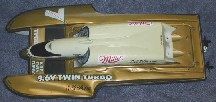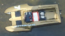 Here's a little background on the Tyco boat. I bought the boat about 15 years ago. I recently got the itch to dig it out of the closet after about five years of disuse. This boat was always abused, used hard and never maintained. For the first time in its life I decided to do some maintenance. The motors were rusted hulks, but I hit them with some motor spray and lube. After a few moments of smoke and fireworks. they settled down and appeared to run normal. Only one of my battery packs is still functional. The boat takes one 9.6 volt 8-cell AA packs. The boat had a wing and some fake jet pods, but I decided to strip them off and save a few ounces of weight. The top pic shows a dent in the side of the boat from when I left it in the car and it melted. The next pic is a shot from the rear.