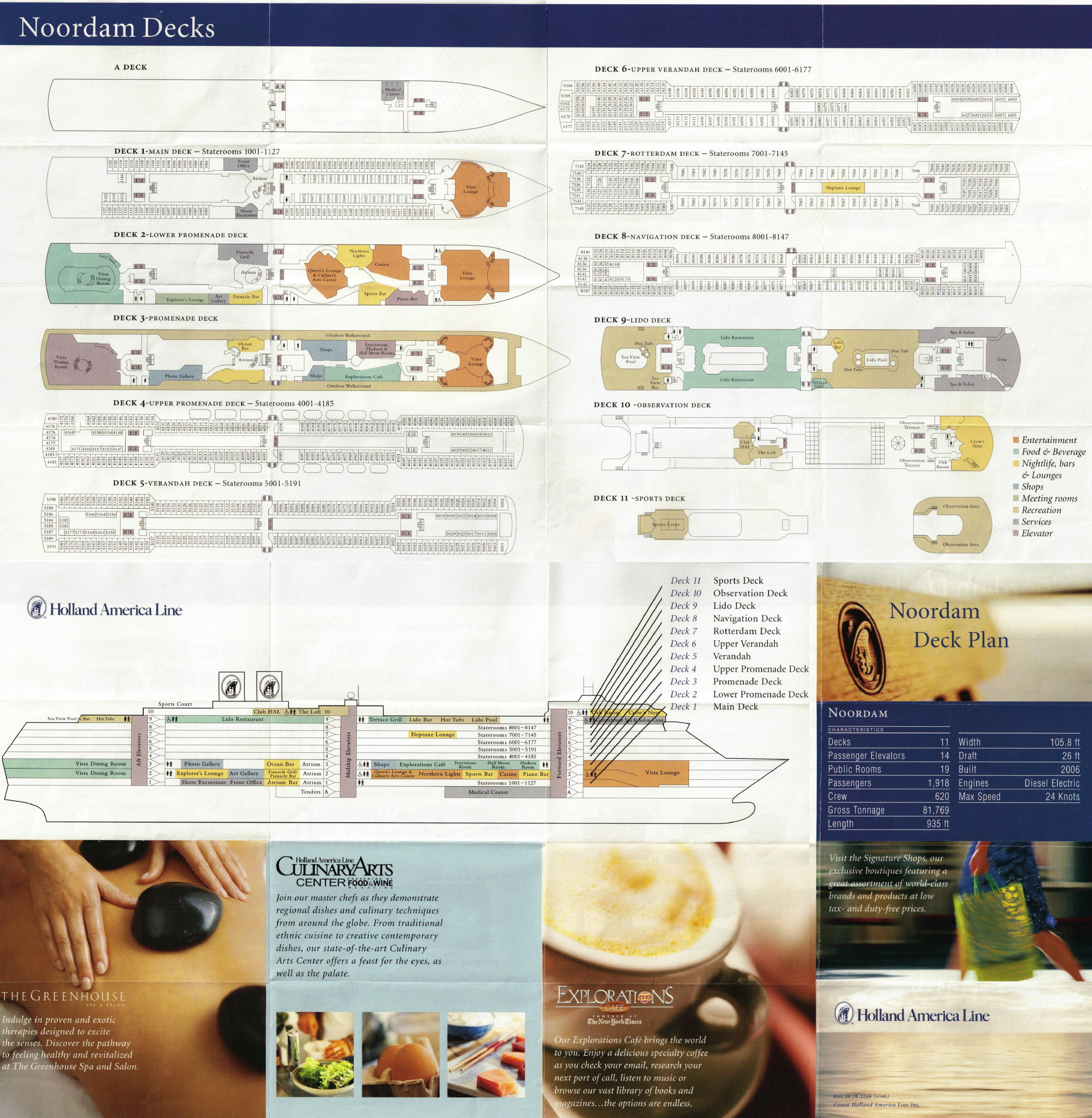 I like looking at deck plans. Shown below is a Noordam Deck Plan pamphlet I got aboard ship. We had starboard-side Deluxe Verandah Suite 7079 on Rotterdam Deck 7 which was pretty nice and not too far away from the Neptune Lounge.