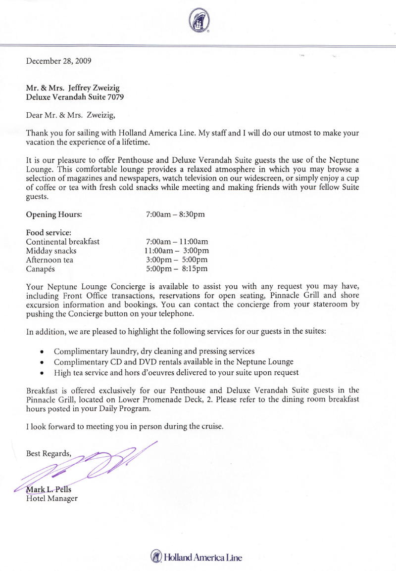 A letter of introduction from the Neptune Lounge, an unfolded luggage tag, and disembarkation instructions. Click thumbnails for larger images.