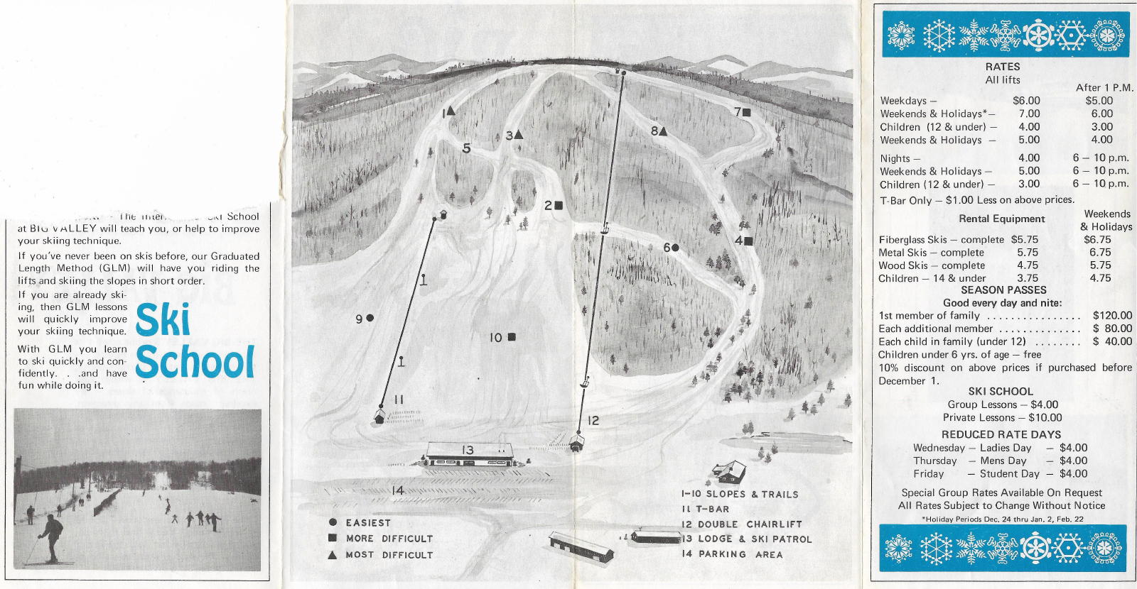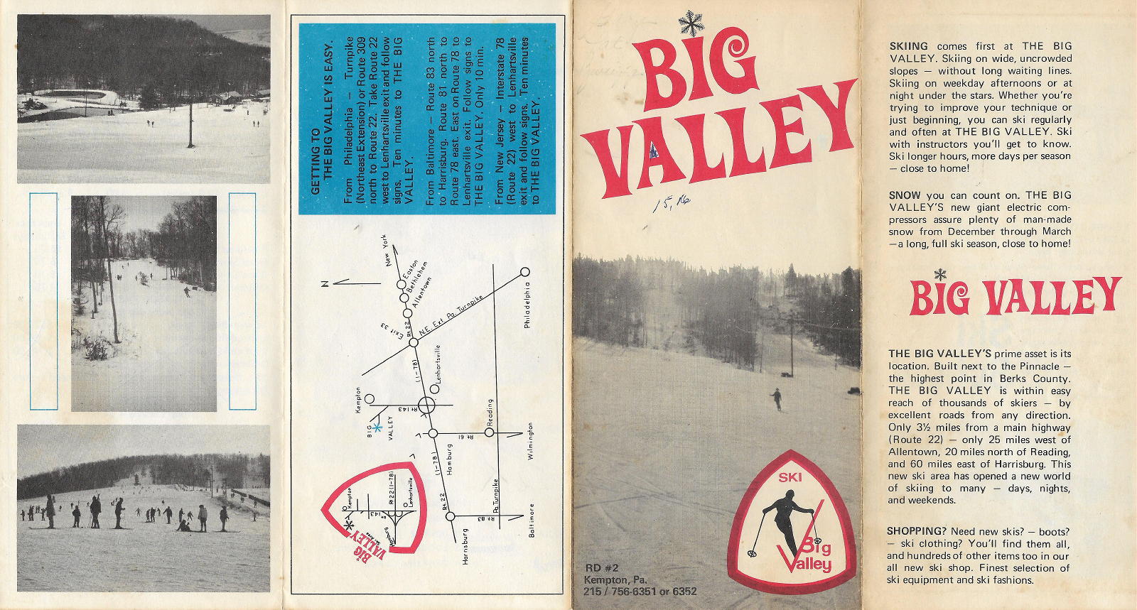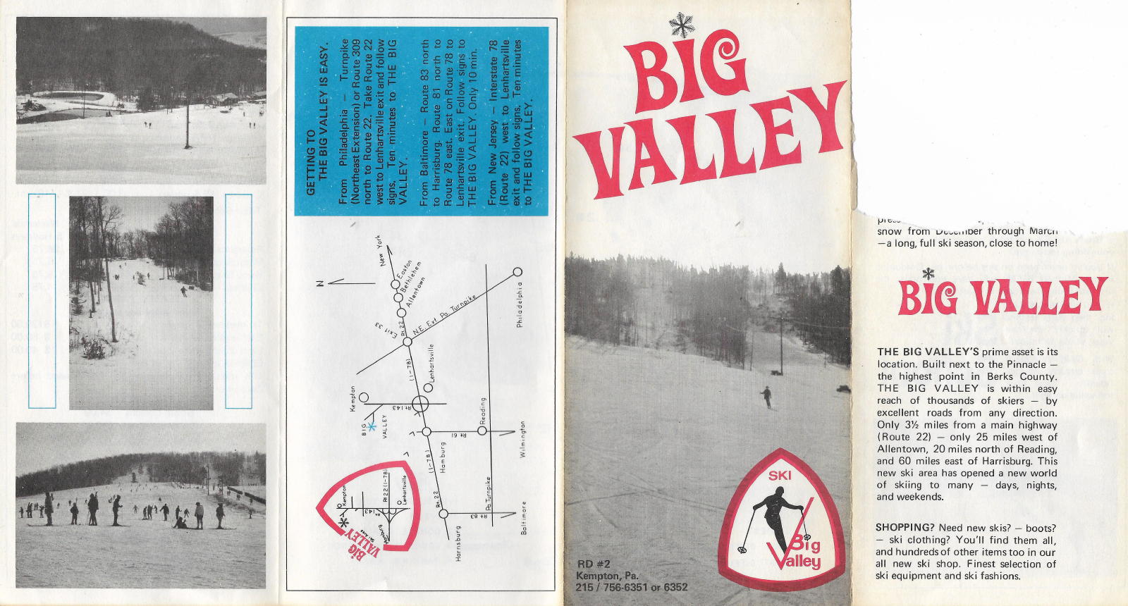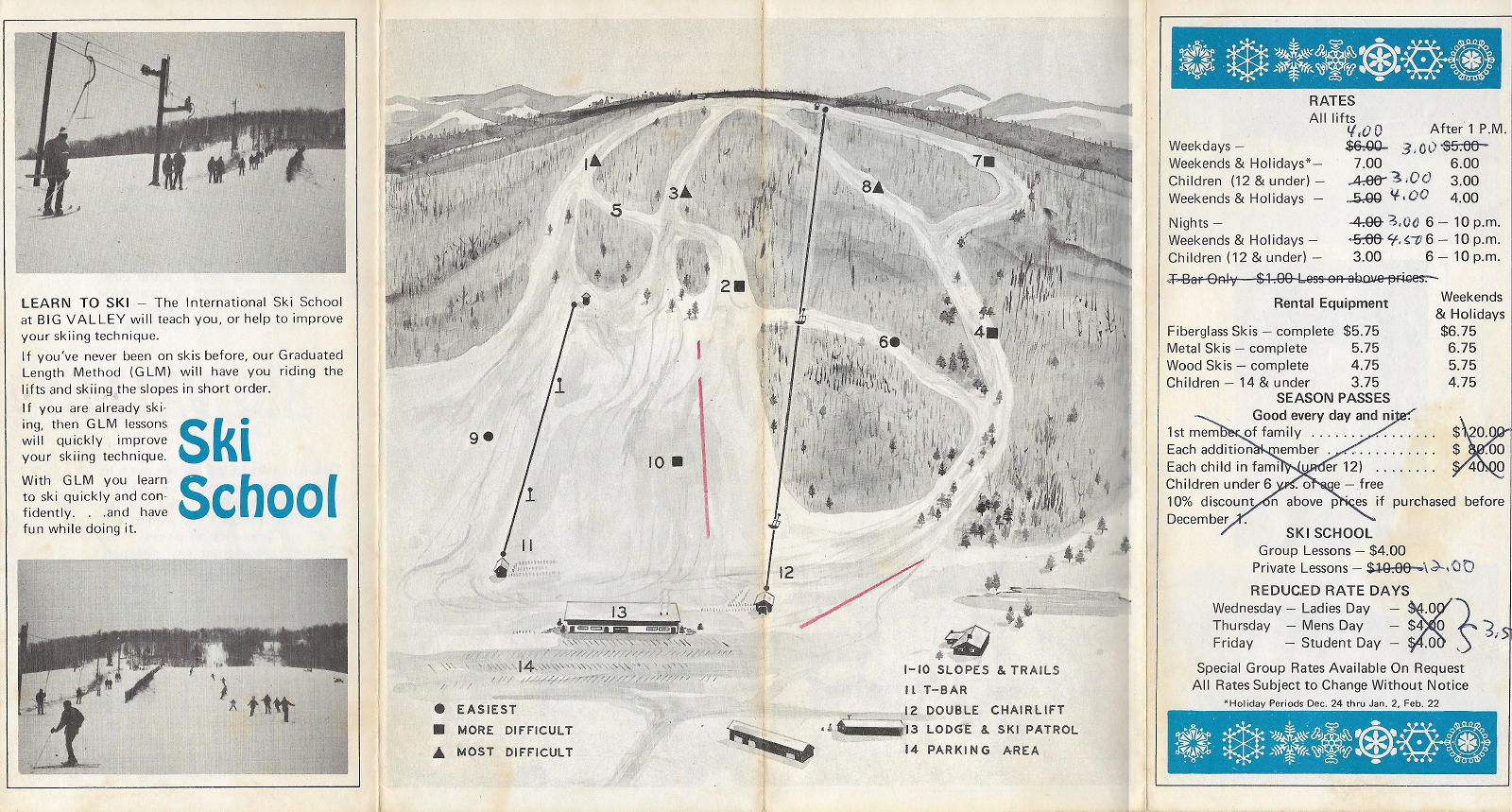 Shown below is an undated Big Valley Brochure. Note that none of the slopes and trails are named. Note that trail 8 (future Appalachian) is listed as "Most Difficult" while trail 7 (future Foxy Lane) is listed as "More Difficult". These designations were reversed during the Hahn era. I believe Hahn regraded the top of Appalachian such that it became the easiest way down from the top. Foxy Lane lacked lights and snow making and was essentially abandoned during the Hahn era. Hahn assigned the name "Big Valley" to trail 3 which was the ski area's most challenging way down from the top. The appendage labeled trail 2 was not maintained and grew in.