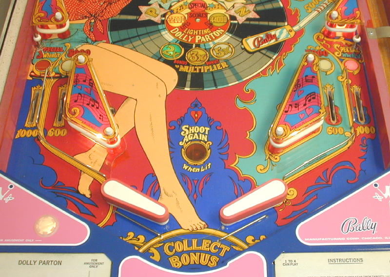 DOLLY PARTON Bonus: The main object of the game is to spell out DOLLY PARTON. Progress is recorded by the DOLLY PARTON lamps in the center of the playfield. Each lit letter is worth 2,000 end-of-ball bonus points. Spelling DOLLY PARTON once lites the 22,000 bonus lamp and lites an alternating outlane for special. Lit outlanes reset at the beginning of each ball. Spelling DOLLY PARTON twice lites the 44,000 bonus lamp. Spelling DOLLY PARTON additional times awards a special. Drop targets multiply the accumulated bonus by 2x, 3x or 5x. Accumulated bonus and accumulated multipliers carry from ball to ball. As noted above, the key to a high score game is maximizing the bonus and multipliers on ball one.