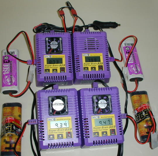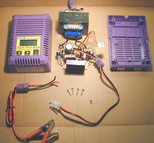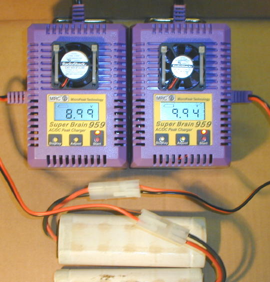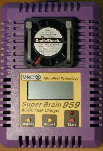Stop. Read this first... My involvement in RC hobbies has long past. I will no longer reply to any inquiries regarding battery chargers, batteries or battery charging. Super Brain Surgery I recently purchased a pair of Super Brain 959 chargers. For the most part, I've been impressed with the chargers' performance, features and price. But, like most people, I'm baffled by the design's lack of effective cooling. After several consecutive charges, the charger case becomes too hot to touch and the display screen begins to malfunction. Many people simply setup a portable fan to cool the chargers. I decided to install a permanent cooling fan. For each charger I used one Micro Fan (Radio Shack 273-240) and one 100 ohm, 1 watt resistor.