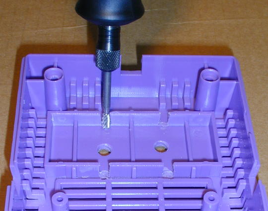 Next I set to work on the bottom half of the enclosure. I wanted to improve airflow around the bottom of the power transformer. I drilled two holes through the bottom of the power transformer tray and I used the Dremel again to grind four slots into the sides of the power transformer tray. Now the transformer has free air circulation around all four sides.