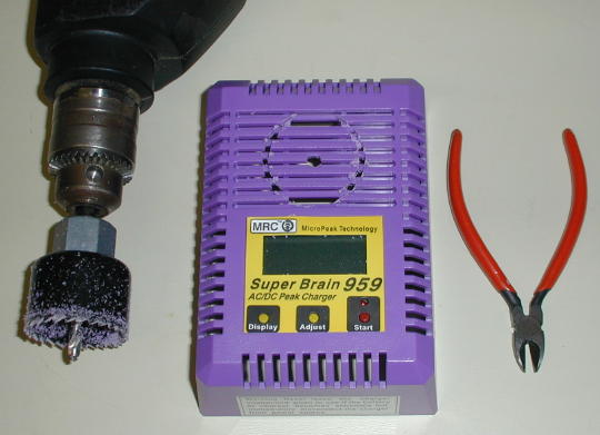 Before my modifications the chargers got too hot to touch and the display would begin to malfunction after two or three charges. With the fan modification the chargers get warm, but never hot and the display always works well. I've used these chargers for hours at a time with no problems. My torture test was to consecutively charge ten packs at 4.5 amps. Again, no problem. Note that the fan will run so long as the charger is plugged in. However, the charger should not be left plugged in while not in use. The fans will also work if you decide to use the dc power input. Notice that the two fans I ended up with are of different designs even though they have the same stock number. The fan with the smaller center would not require the louver modifications I described above. However, I would still recommend removing the top layer of louvers to promote better airflow. If you have the choice, I'd also recommend buying the fan with the smaller center because it has more blade area and seems to move more air. I've already purchased an additional "small center" fan that I may use to replace the "large center" one. Disclaimer... I am an electronics amateur. I designed this circuit by way of tinkering and trial and error. There is no CAD system. There is no laboratory. There are no research assistants. There is no UL approval. I'll not be responsible for you blowing up your charger, burning down your house, electrocuting yourself or any other havoc you may cause in your attempts to duplicate this project. Super Brain Surgery Update It's been more than a year since I purchased my first pair of MRC Super Brain 959 chargers and added my cooling fan modification. I've been happy with their performance so I recently purchased a second pair of Super Brain 959 chargers and set about modifying them with cooling fans as I did with the first pair. I mostly followed the same procedure as before, but with a few differences. Note that the newer Super Brains appear to use standard phillips head screws, so you won't need to make a modified screwdriver as before. WARNING, the following modifications will void your warranty. I quote from the Super Brain manual, "MRC will not accept any charger for repair that has been modified in any way". Proceed at your own risk. The first difference is I decided to use a 1.5 inch hole saw to cut away the upper layer of louvers where the fan will be mounted. I found that the pilot bit in the center of the hole saw was too awkward to control around the delicate louvers. So I started out with many smaller drill bits and slowly worked my way up to the size of the pilot bit. There are seven rows of louvers. I found the center of the fourth louver and that's where I started drilling. Cut carefully and check your work often. Remember, you only want to cut through the top layer of louvers. After the cut has been made, use a small pair of wire cutters to cut away the top layer of louvers inside the circle. Finally, I cleaned up all my cuts with a sharp hobby knife. The pic below shows the charger after I used the hole saw, but before I took the wire cutters to it.