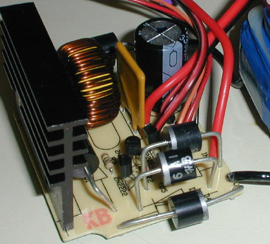 I connected the fan to the output of the bridge rectifier as shown. The voltage here is a filtered dc voltage of about 20 volts. That's a bit high for the fan so I inserted a series 100 ohm, 1 watt resistor. With the resistor, the fan voltage is about 12 volts. I simply soldered my connections to the diode leads as shown then I covered the resistor with a blue piece of shrink tube. Specifically, viewing the circuit board with the heat sink to the left and the power transformer to the right, the black fan wire is soldered to the left lead of the closest diode, the resistor is soldered to the left lead of the second closest diode and the red fan wire is soldered to the other end of the resistor. Be sure to observe proper polarity here. If you follow the circuit board traces, you'll see that the fan is connected in parallel with the big capacitor and that the polarity of the fan matches the polarity of the capacitor. The picture below shows the connections before the shrink tube was slid into place and shrunk.