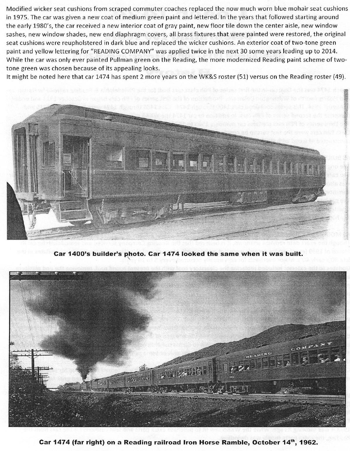 Coach 1474 was 100 years old in 2014. Below are two items complied by long-time WK&S volunteer Tom Loeper including a two-sided postcard and a detailed history flyer.